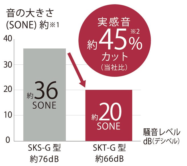 ※2 SKT-G型の実感音(約20SONE)と当社従来品SKS-G型の実感音(2015年製約36SONE)との比較。 当社基準値。本体正面より1mでの測定値