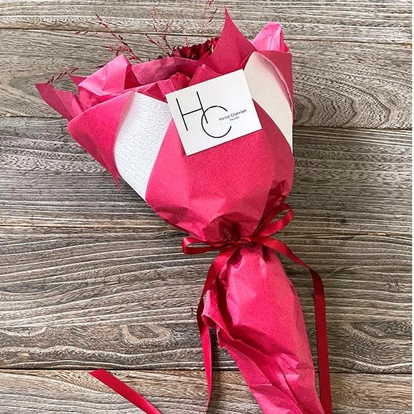 エルベ・シャトランブーケの魅力の一つは、まるでドレスをまとったようなラッピングです。ラッピングを解くと中のブーケもリボンで束ねられていますので、リボンは外さず花瓶の中へそのまま活けて下さい。