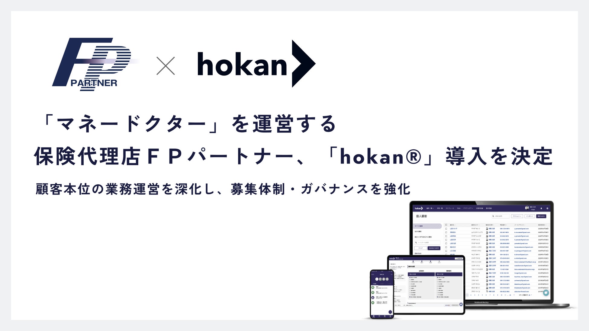 「適正な営業活動」と「組織の強固な監査体制」を実現するクラウド型保険代理店システム「hokan®︎」を提供する株式会社hokan(ホカン、本社:東京都中央区、代表取締役社長:横塚 出、以下:当社)は、株式会社FPパートナー(エフピーパートナー、本社:東京都文京区、代表取締役社長:黒木 勉、以下:FPパートナー)において、顧客本位の業務運営と管理体制の抜本的改革を進める中で、2026年4月からの「hokan®︎」利用開始に向けて導入決定したことをお知らせいたします。