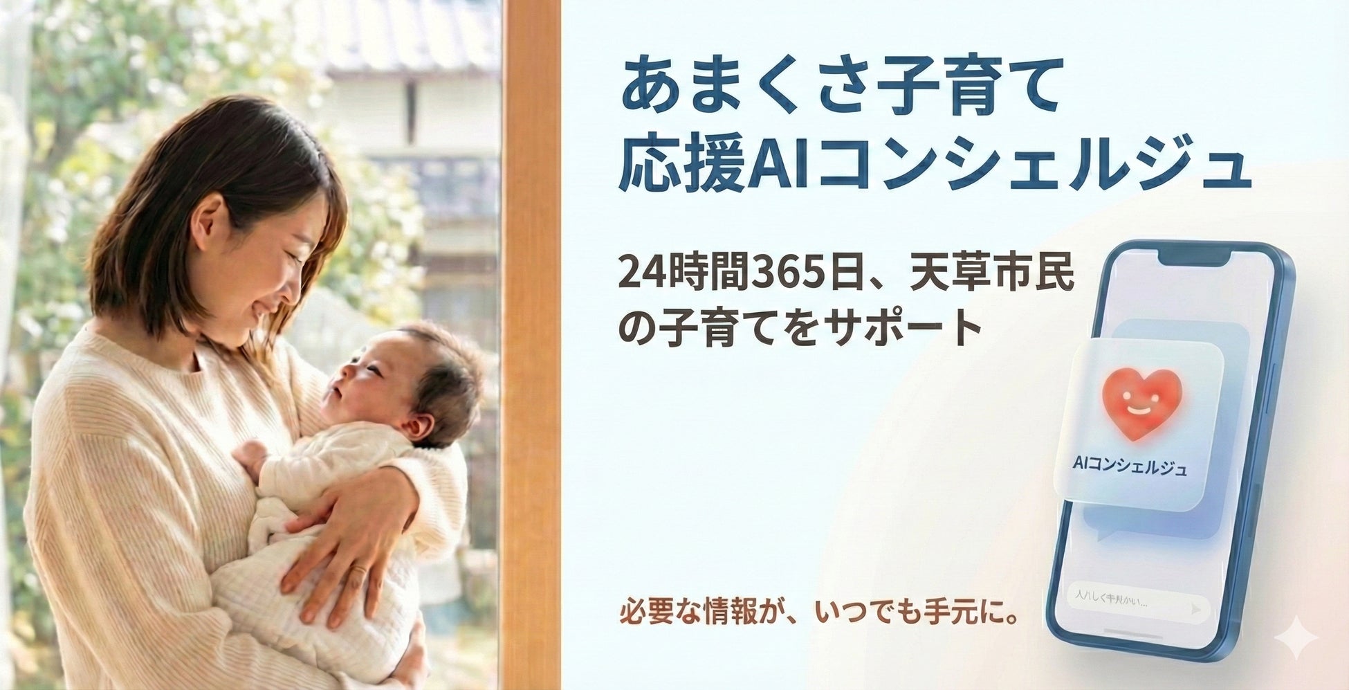 天草市と連携し、子育ての「困った!」に寄り添う「あまくさ子育て応援AIコンシェルジュ」のテスト運用を開始。市民の利便性向上と子育て支援DXを加速へ