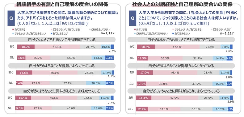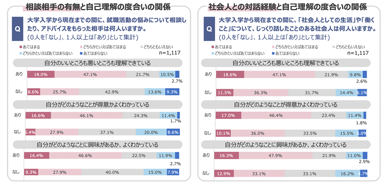 ・大学入学から回答時までの間に、就職活動の悩みについて周囲に相談をしたり、アドバイスをもらったりしたことがある人は、「自分のいいところ・悪いところ」「どのようなことが得意か」「どのようなことに興味があるか」のいずれについても理解度が高い。また、社会人としての生活や働くことについて、社会人とじっくり話した経験の有無についても同様の傾向がみられる。