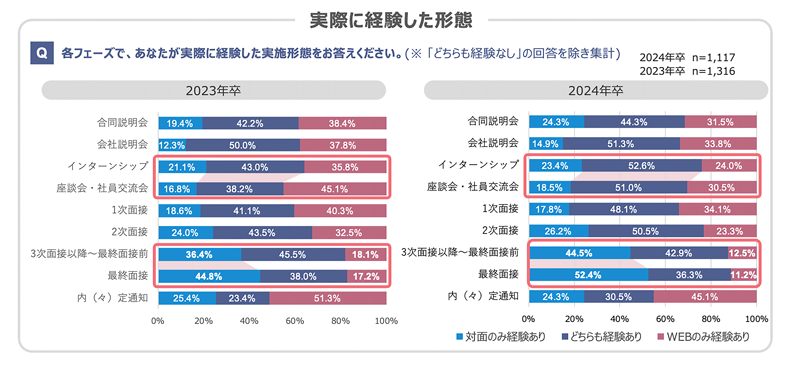 ・3次面接以降~最終面接前について「対面のみ経験あり」は2023年卒が36.4%、2024年卒が44.5%、最終面接について「対面のみ経験あり」は2023年卒が44.8%、2024年卒が52.4%と対面の比率が大きく増えている。