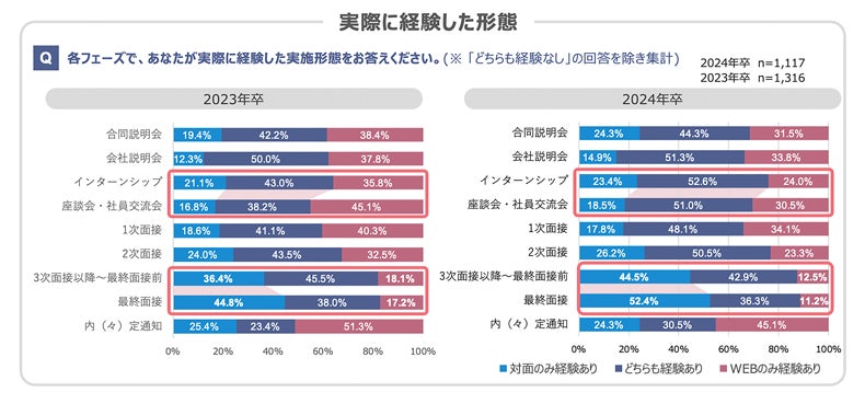 ・2024年卒は2023年卒と比較すると、いずれのフェーズでも「WEBのみ経験あり」の比率が減少。