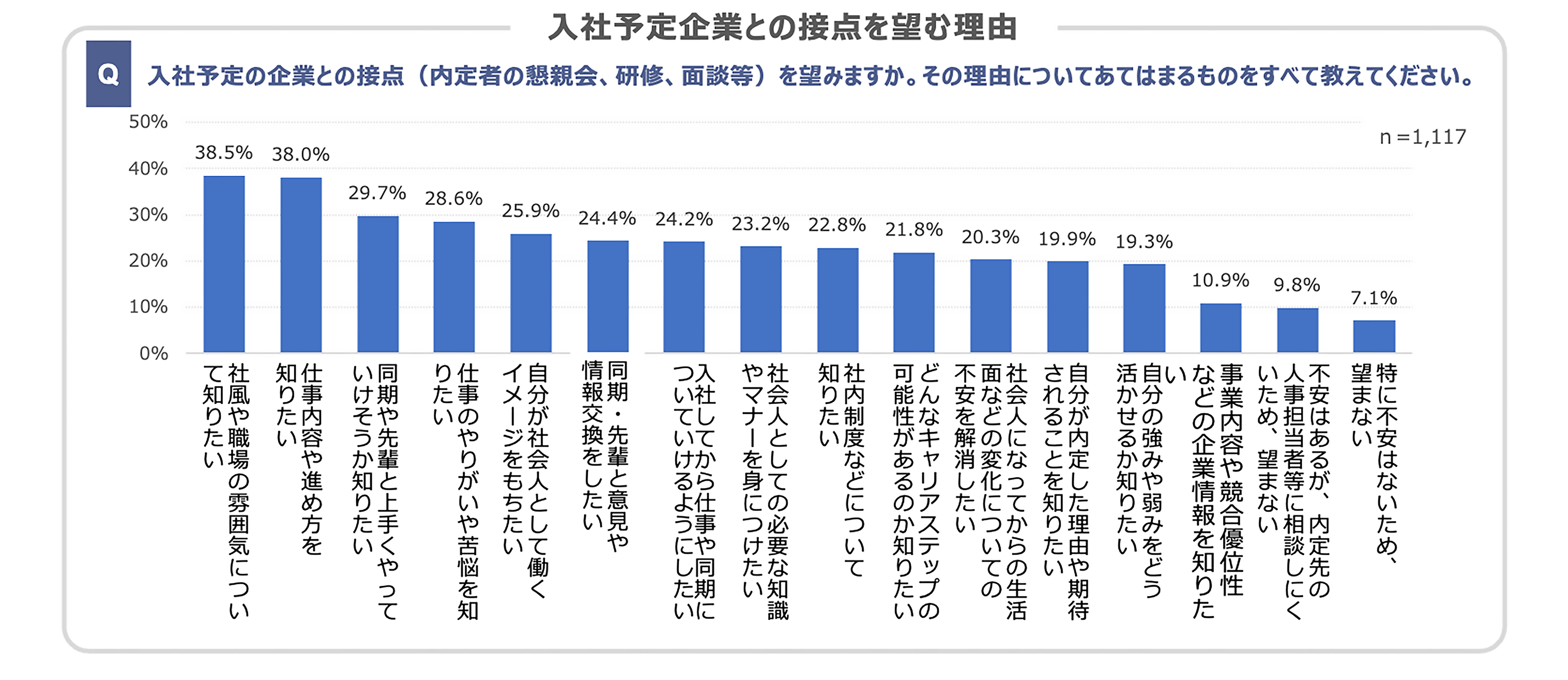 ・入社予定の企業との接点を望む理由TOP3としては「社風や職場の雰囲気について知りたい」が38.5%、「仕事内容や進め方を知りたい」が38.0%、「同期や先輩と上手くやっていけそうか知りたい」が29.7%。