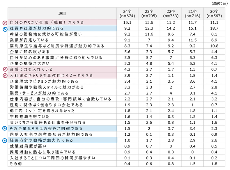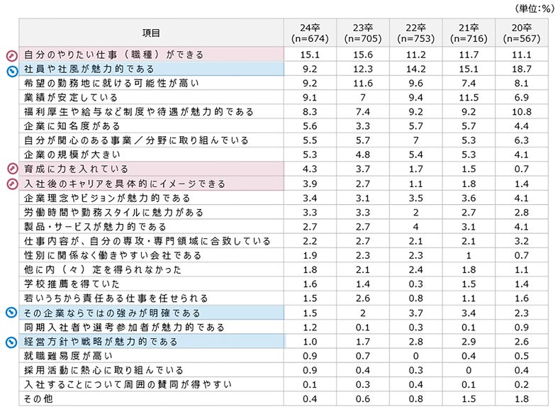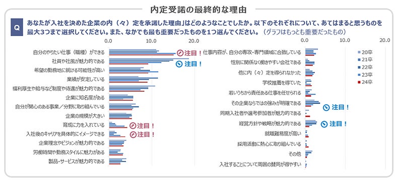 ・内定承諾の最終的な理由は「自分のやりたい仕事(職種)ができる」が15.1%で最多。次点は「社員や社風が魅力的である」の9.2%だが、選択率は年々低下。