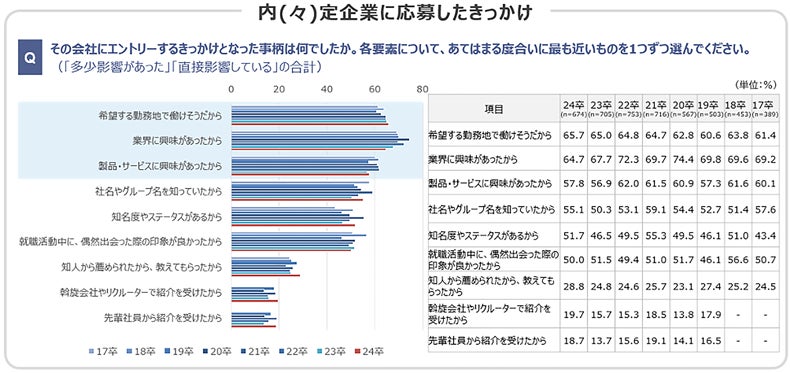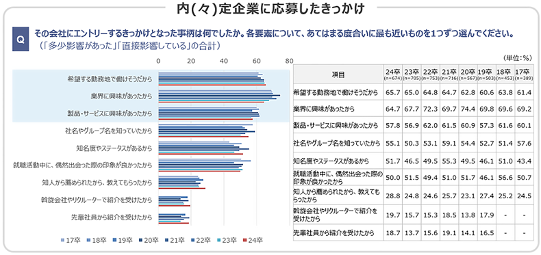 今年の調査では、内(々)定先企業へのエントリーのきっかけとして「業界への興味」とほぼ同水準で「勤務地」が1位となりました (図表3)。