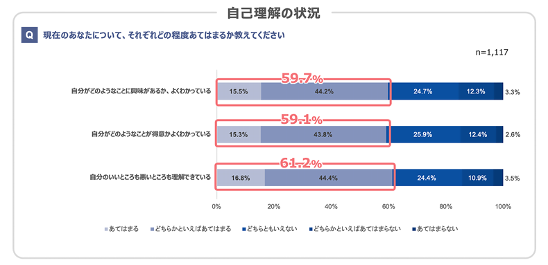 ⇒納得感のあるキャリア構築に向けては深い自己理解が前提となるが、就職活動を経ても自己理解ができているとする割合が6割というのは高い数字とはいえない。