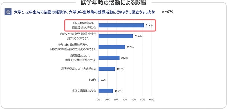 ・大学1・2年生時に就職活動の一環としてイベント等に参加したことがある学生のうち、51.4%が「自己理解が深まり、自己分析がはかどった」と回答。