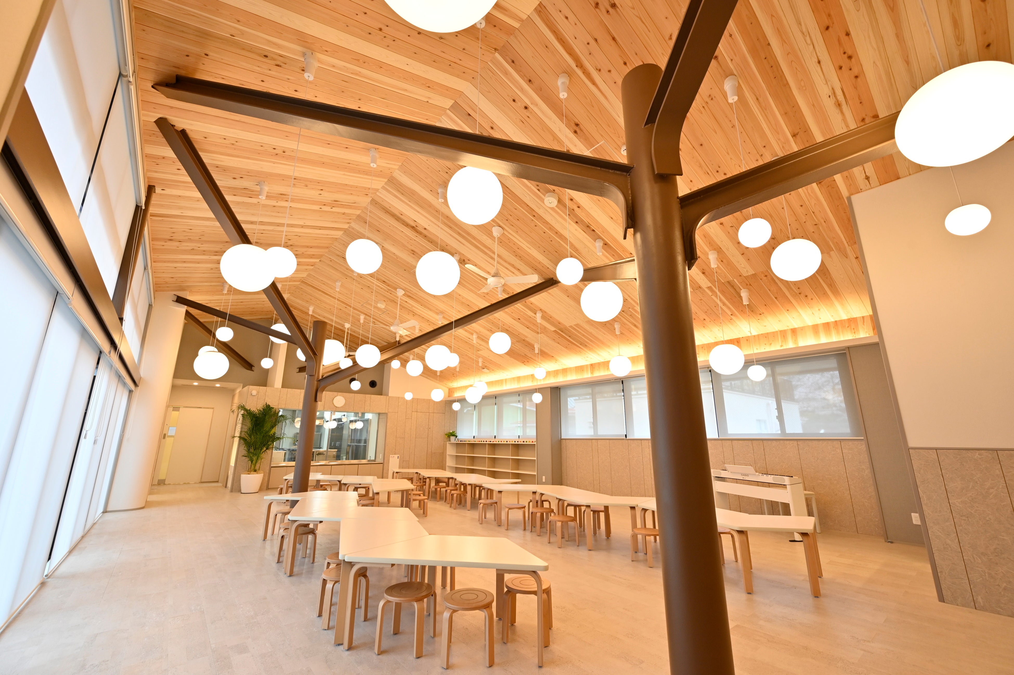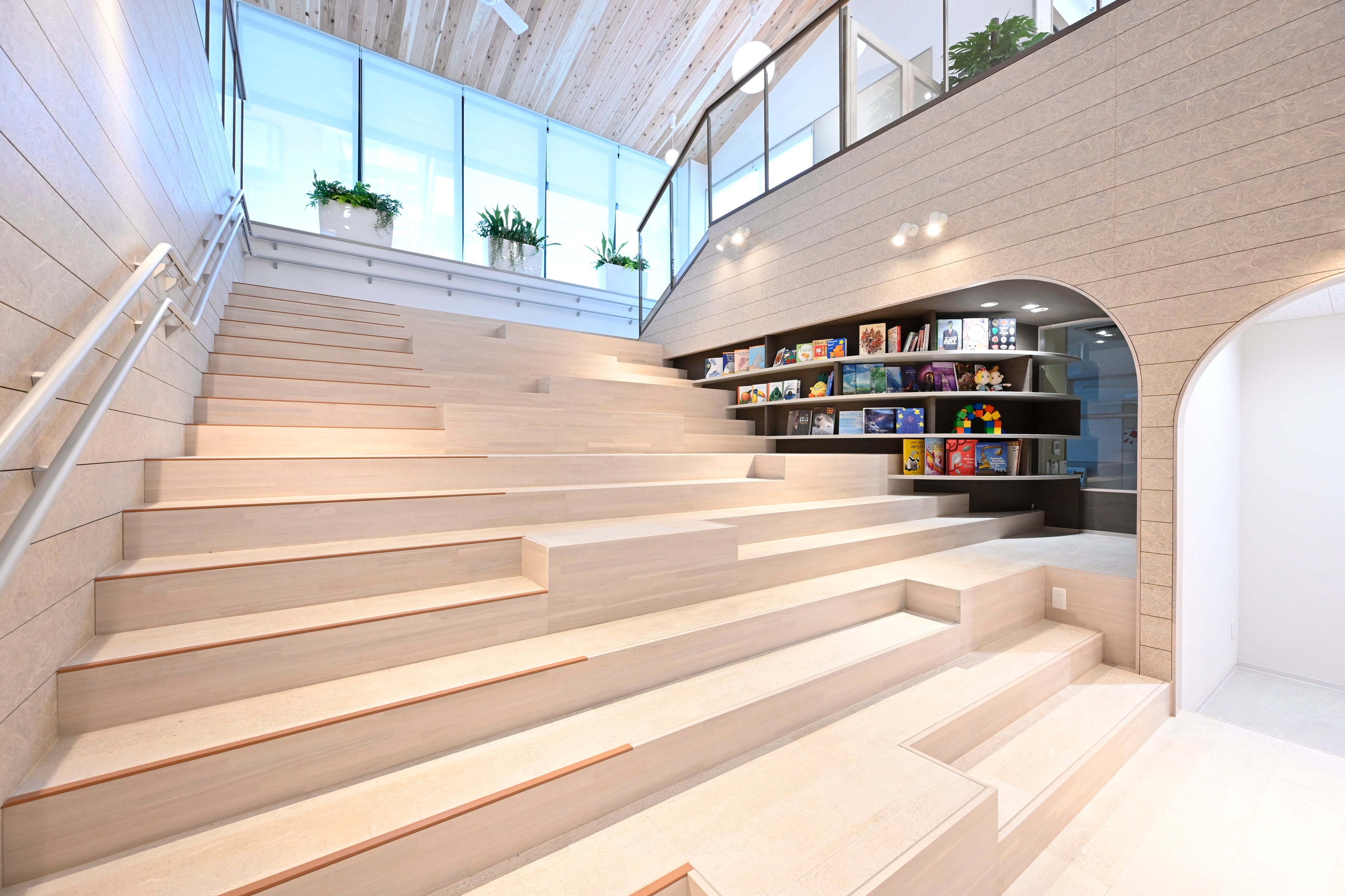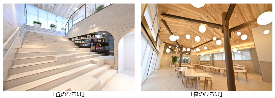 品川区にある認定こども園で、目黒駅、五反田駅から徒歩10分にある旧公務員宿舎跡地に設置された2階建ての施設です。「自然との共存」をコンセプトに壁面はコルクボード、床材はリノリウム、天井には天然石など、天然素材をふんだんに使用した内装となっております。1階から2階にあがる階段は「丘のひろば」と呼んでおり、映像や読書を通して知識を身に着ける、静の活動のスペースとなっています。2階にはマルチホール「森のひろば」があり、異年齢でのランチ、運動遊びや制作活動などを行っています。また森のひろばに隣接してテラスがあり、野菜の栽培などを実施し、普段から自然を感じ触れられる空間が広がっています。