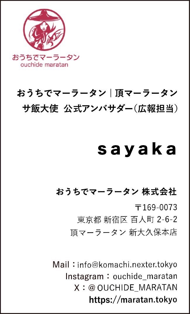 SNSマーケティング事業を行う ネクスター株式会社(本社:東京都 新宿区、代表取締役社長CEO:細田悠巨)のグループ会社である、D2Cブランド事業を行う おうちでマーラータン 株式会社(本社:東京都 新宿区、共同代表 齋藤悠)が運営するD2Cブランド『おうちでマーラータン』( https://maratan.tokyo )は、新大久保に本店を構える『 頂マーラータン 新大久保 本店 』の味をおうちで簡単に味わえるようにした冷凍麻辣湯のヘルシーD2Cブランドです。その公式アンバサダー(広報担当)として、sayakaが就任し、ネクスター・オフィシャル・パートナーシップ契約を締結しましたことをこちらにお知らせいたします。
