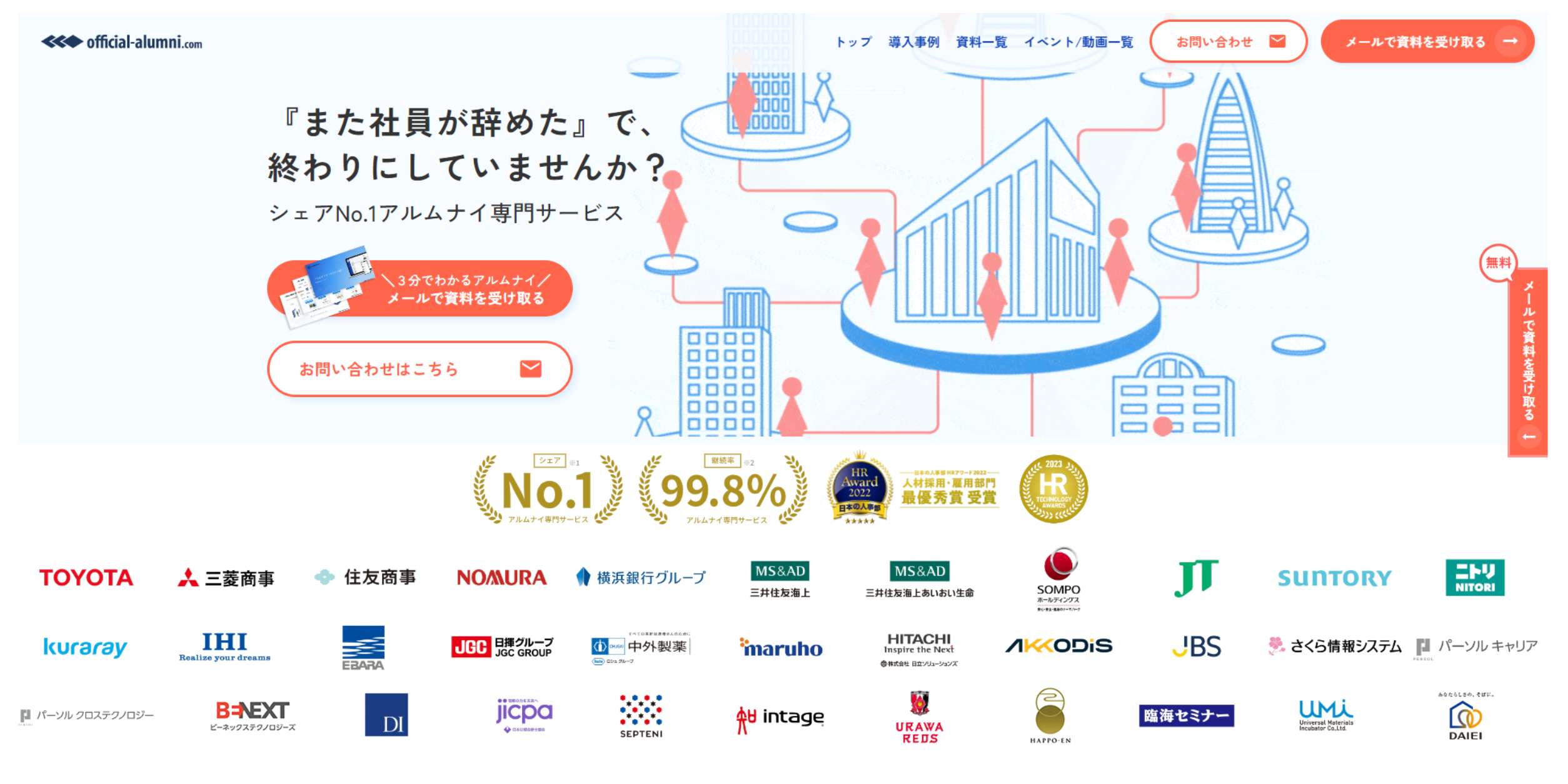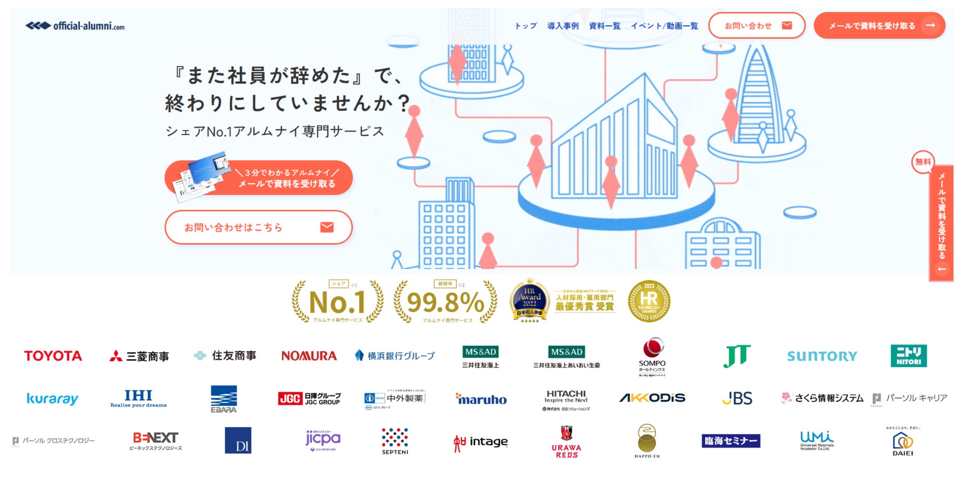 企業とアルムナイ(退職者)が退職後もつながる「企業と個人の新しい関係」の実現に向けて、アルムナイ特化型クラウドシステム『Official-Alumni.com』( https://official-alumni.com/)の提供やコンサルティングのほか、退職で終わらない企業と個人の新しい関係を考えるメディア『アルムナビ』( https://alumnavi.com/ )を運営しています。