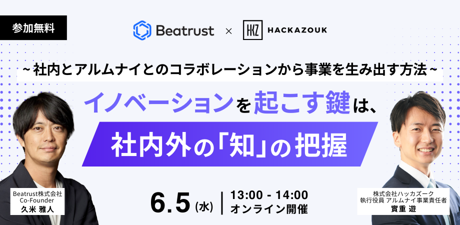 その中で本セミナーでは、Beatrust株式会社からは、社員間協業・コラボレーションを生むための仕掛けづくり について、アルムナイ事業を展開しております株式会社ハッカズークからはアルムナイと繋がりを作り協業を生む方法を解説し、社内だけでなく社外関係資本であるアルムナイを巻き込み、イノベーションを起こすためのポイントについて対談も交えながら深掘っていきます。
