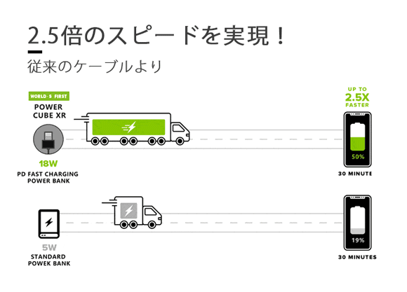 PD充電に対応しているバッテリーとケーブルを使用することによって、一度に送信できるW数が3.6倍になります。