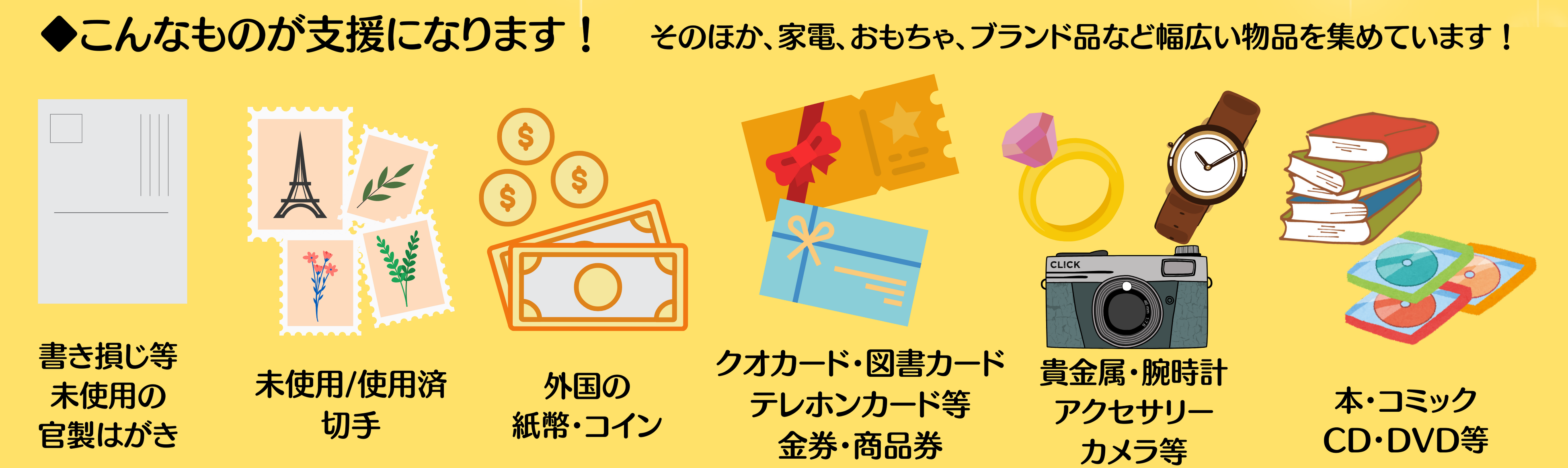 【収集対象】ご自宅に眠っている切手やハガキ、外国のお金、商品券、アクセサリー、古本など。