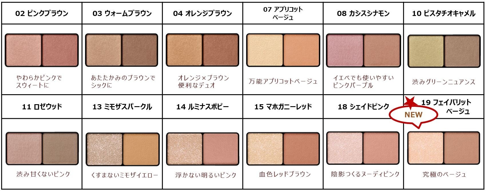 ーなめらかなツヤを放つ 「シルクカラー 」と、ぬくもりのあるマットな 「カシミヤカラー 」 の2種をセット。 ー肌なじみのよいゴールドパール配合