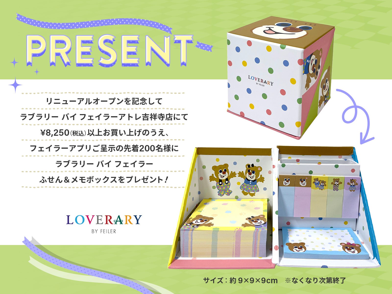 ラブラリー バイ フェイラー アトレ吉祥寺店にて¥8,250(税込)以上お買い上げのうえ、フェイラーアプリご提示の先着200名様にラブラリー バイ フェイラーふせん&メモボックスをプレゼントいたします。
