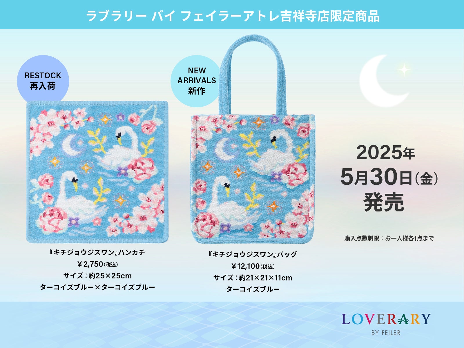 リニューアルオープンを記念して、5月30日(金)、ラブラリー バイ フェイラーアトレ吉祥寺店限定商品『キチジョウジスワン』バッグが登場いたします。またハンカチも再入荷いたします。