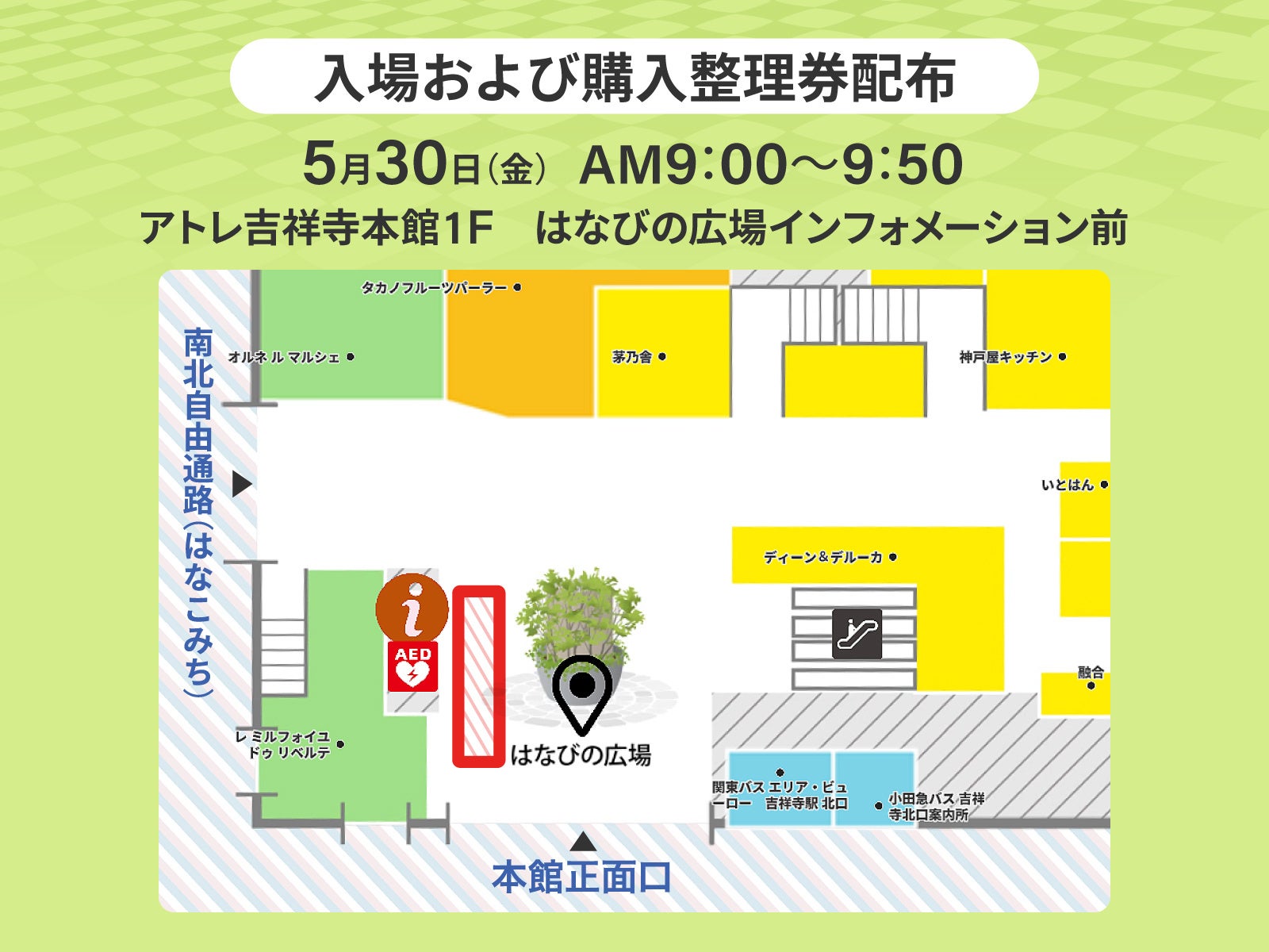 店舗限定商品発売日5月30日(金)は、AM9:00よりアトレ吉祥寺本館1F正面口はなびの広場インフォメーション前にて、入場整理券および購入引換券を配布いたします。