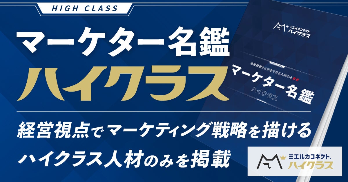 「マーケター名鑑-ハイクラス-」は、ミエルカコネクト登録の約1,000名のマーケターの中から、役員・CMO・事業責任者の経験がある方のみをまとめた冊子です。経営視点でマーケティング戦略を描ける、経営者の右腕となって伴走できるハイクラス人材のみピックアップして掲載しています。