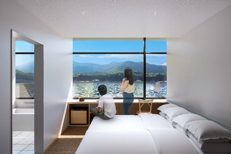 2階部分は宿泊者の客室とラウンジを配置。目前に広がる瀬戸田水道と、そこを行き交う船を眺めながら過ごすことができる構成となっている。