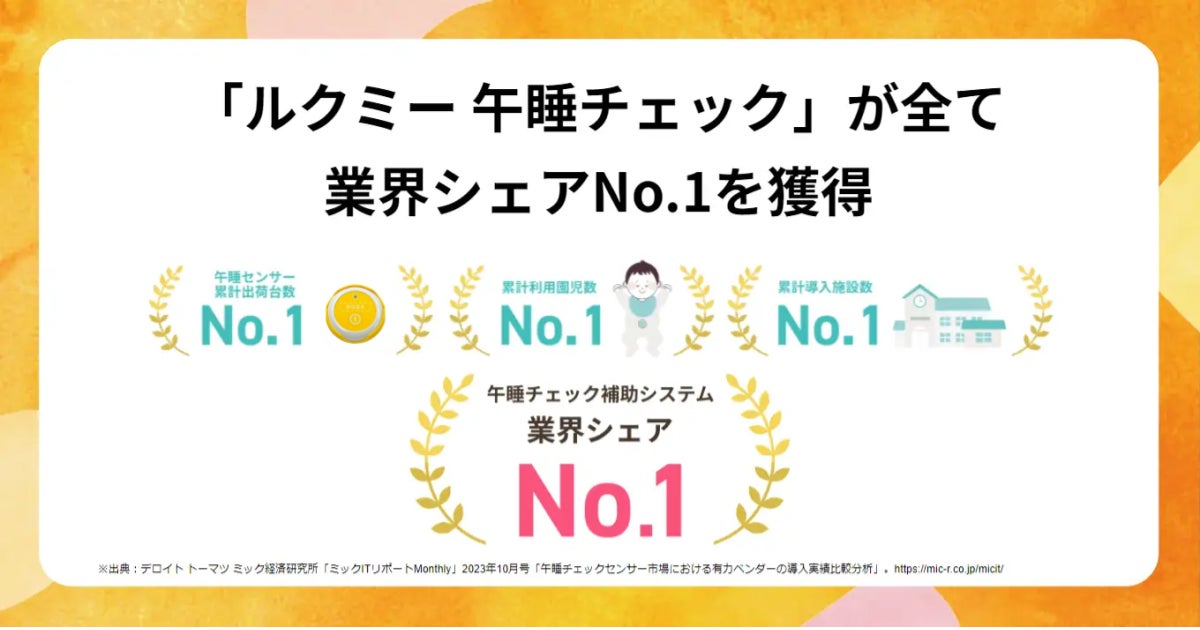 なお「ルクミー午睡チェック」は、デロイトトーマツミックが発刊した「ミックITリポートMonthly」(2023年10月号)「午睡チェックセンサー市場における有力ベンダーの導入実績比較分析(https://mic-r.co.jp/micit/2023/)」において2022年度におけるセンサー出荷台数、累計利用園児数、累計導入施設数、全てにおいてシェアNo.1を獲得しています。