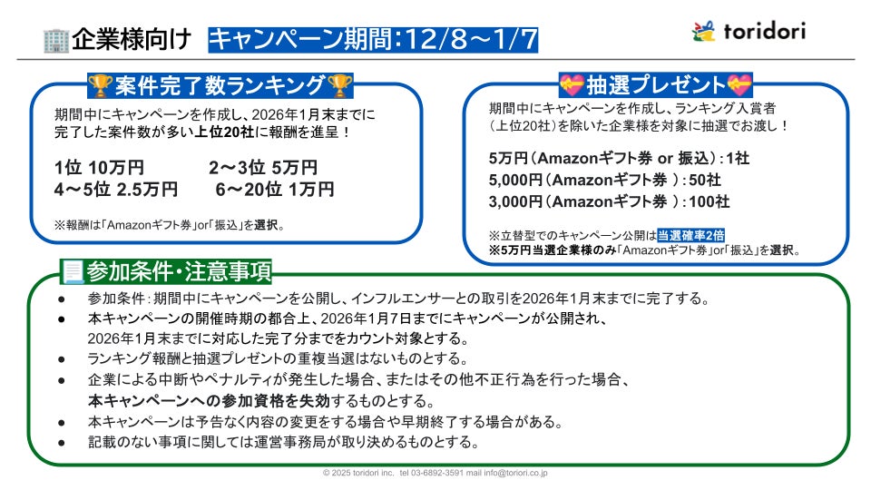 インフルエンサーマーケティングプラットフォーム『toridori marketing/toridori base(トリドリマーケティング/トリドリベース)』を中心としたインフルエンサーマーケティング事業を手がける株式会社トリドリ(本社:東京都渋谷区、代表取締役社長CEO:中山貴之、証券コード:9337、以下toridori)は、2025年12月8日(月)〜2026年1月7日(水)の1ヶ月間「年末年始スタートダッシュキャンペーン」を実施することをお知らせいたします。