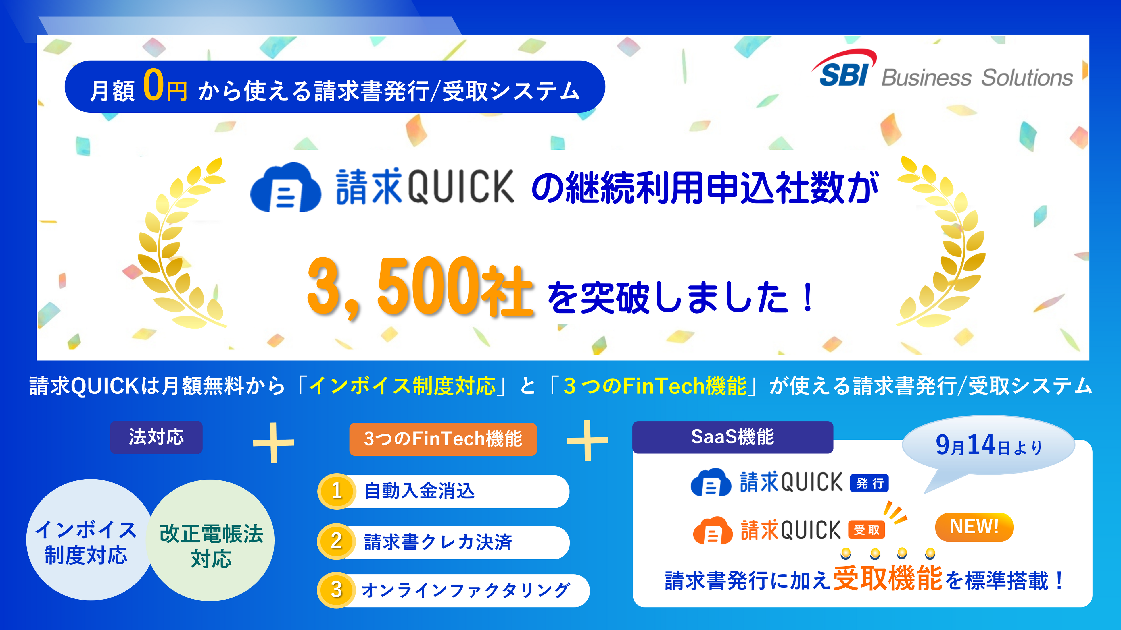 総合フィンテックソリューション企業であるSBI FinTech Solutions株式会社の子会社で、バックオフィス支援サービスを提供するSBIビジネス・ソリューションズ株式会社(本社:東京都港区、代表取締役社長:夏川 雅貴、以下「当社」)は、中小企業のインボイス制度対応と業務効率化をサポートするクラウド型請求書管理システム「請求QUICK」において、継続利用のお申し込み社数が3,500社を突破しましたので、お知らせいたします。
