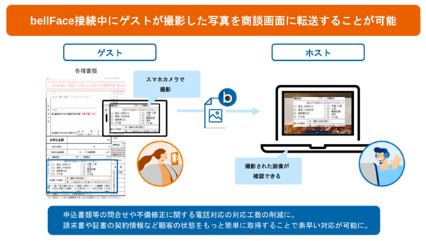 *1 スマートフォンのカメラ機能を用い、ゲスト側(ご相談者)で写真を撮影すると、bellFaceを繋いだままホスト側(弁護士)に写真を送信できる機能。