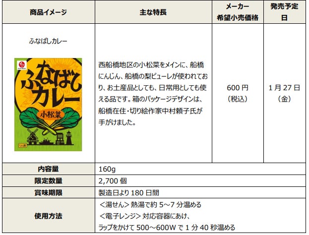 無添加調理※で商品作りを進めている石井食品株式会社 (本社:千葉県船橋市、代表取締役社長執行役員:石井智康、以下、石井食品)と、一般社団法人船橋市観光協会(会長:伊藤 將美 浜町 2-1-1 ららぽーと TOKYO-BAY 西館 1F)は、地元船橋の食材である小松菜などを具材にした「ふなばしカレー」を共同開発し、本日 1 月 27 日(金)より発売をスタートします。今後も船橋市の農水産業を盛り上げられるよう、地域活性化に向けた取り組みを行っていきます。