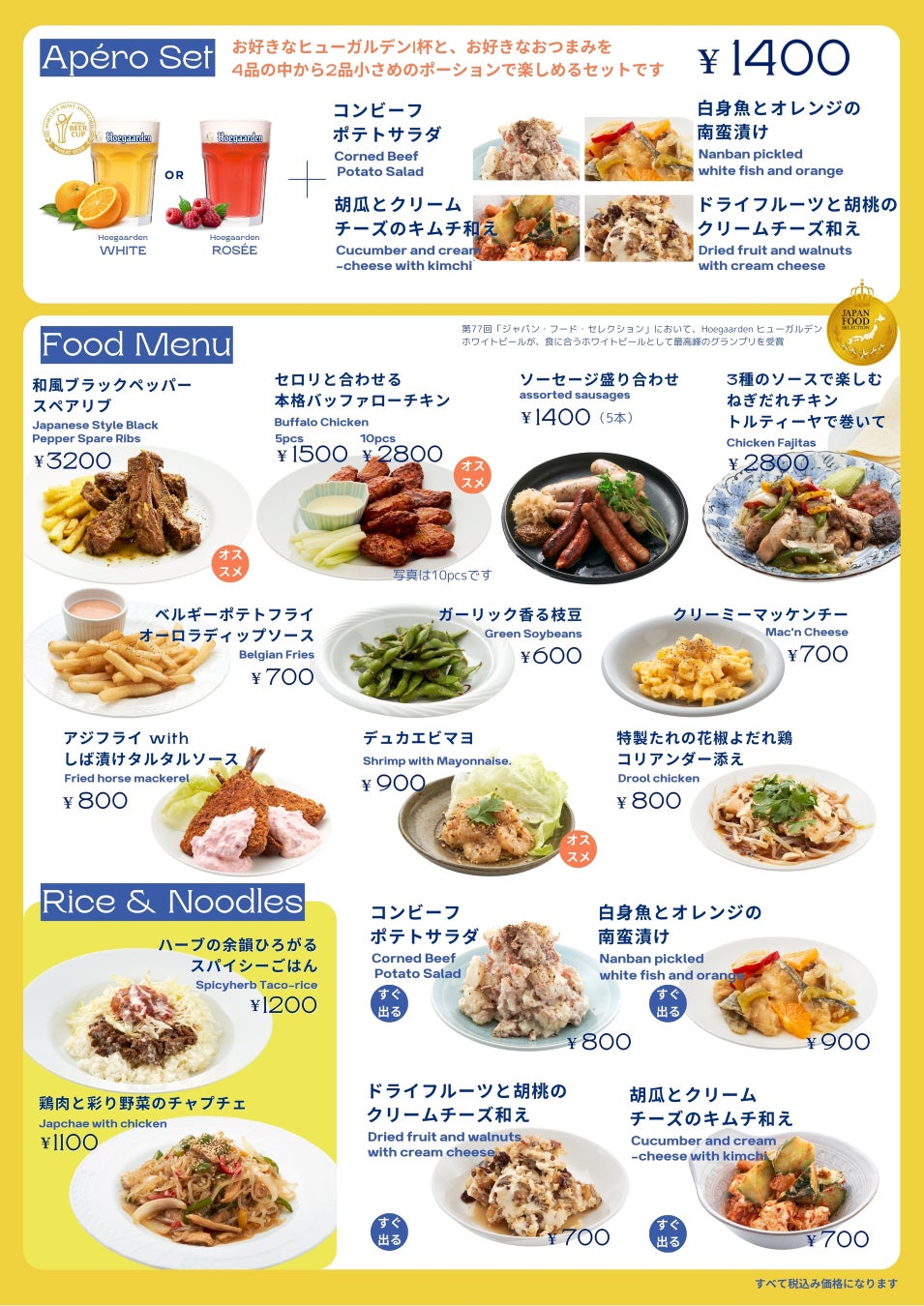 ヒューガルデンが生まれた地であるベルギーを代表する「ベルギーポテトフライ」をはじめ、アジア料理など幅広いラインナップを通して様々な食事と相性がよく、フードの味わいを引き立てる唯一無二のヒューガルデンの魅力を楽しんでいただけます。気軽に短時間でも様々なバリエーションを楽しんでいただけるアペロセットや、事前予約限定の飲み放題付きスペシャルコースもご用意しております。