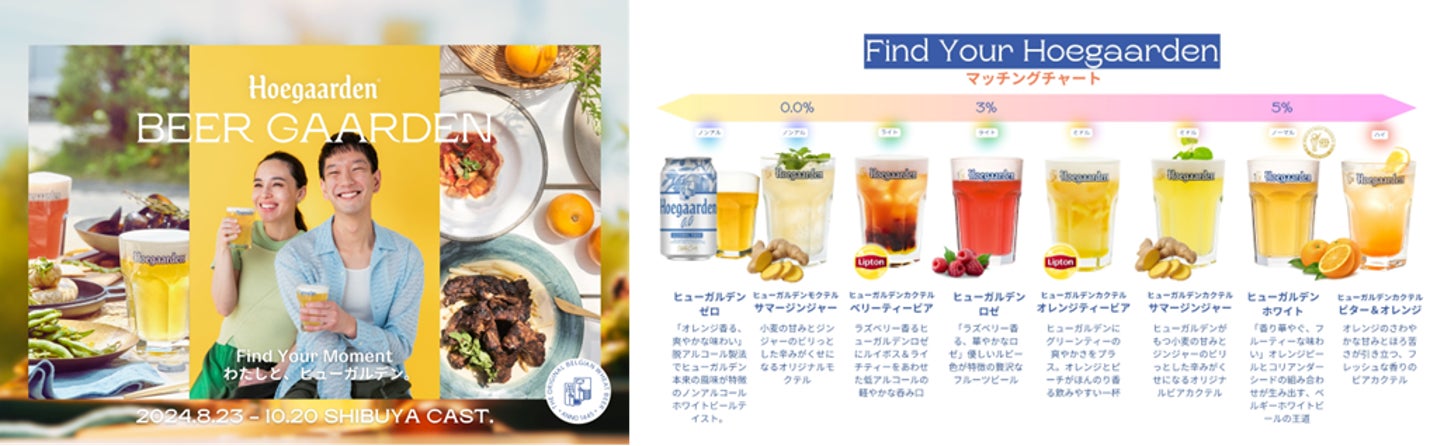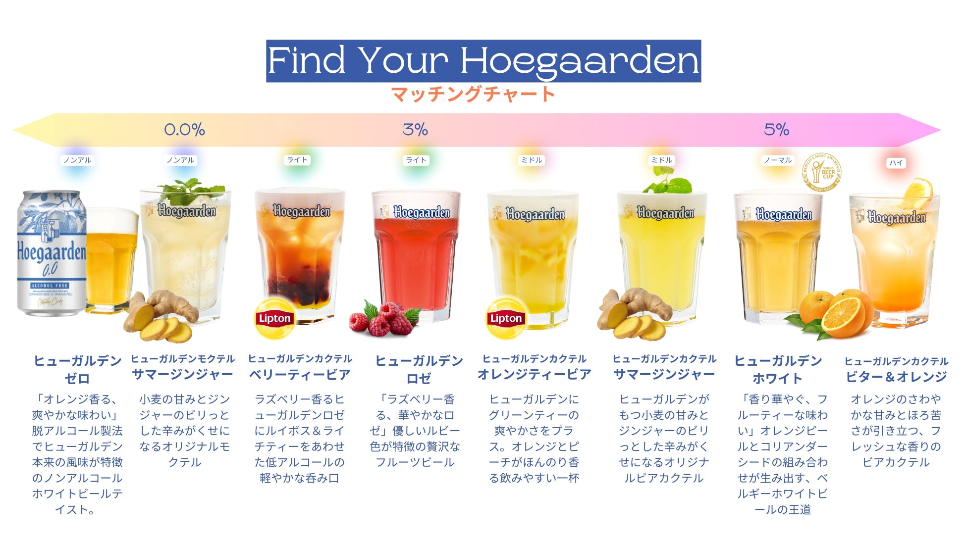5段階のアルコール度数のヒューガルデンを「マッチングチャート」から選べるスペシャルバーが新登場!紅茶ブランド「リプトン」と初のコラボレーションビアティカクテルも登場し、合計8種類のヒューガルデンを提供