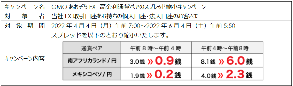 | キャンペーン名 | GMOあおぞらFX 高金利通貨ペアのスプレッド縮小キャンペーン |