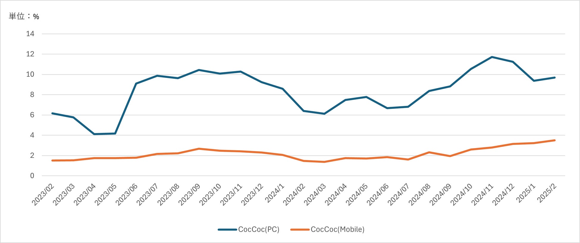 ベトナムにおいては、Coc Coc のシェア率が増加傾向にあり、前回調査(2024年7月)時点のシェア率と比較すると、PCで3.0%、モバイルで1.7%の上昇(※本レポートの完全版に記載の国別一覧表参照)となりました。
