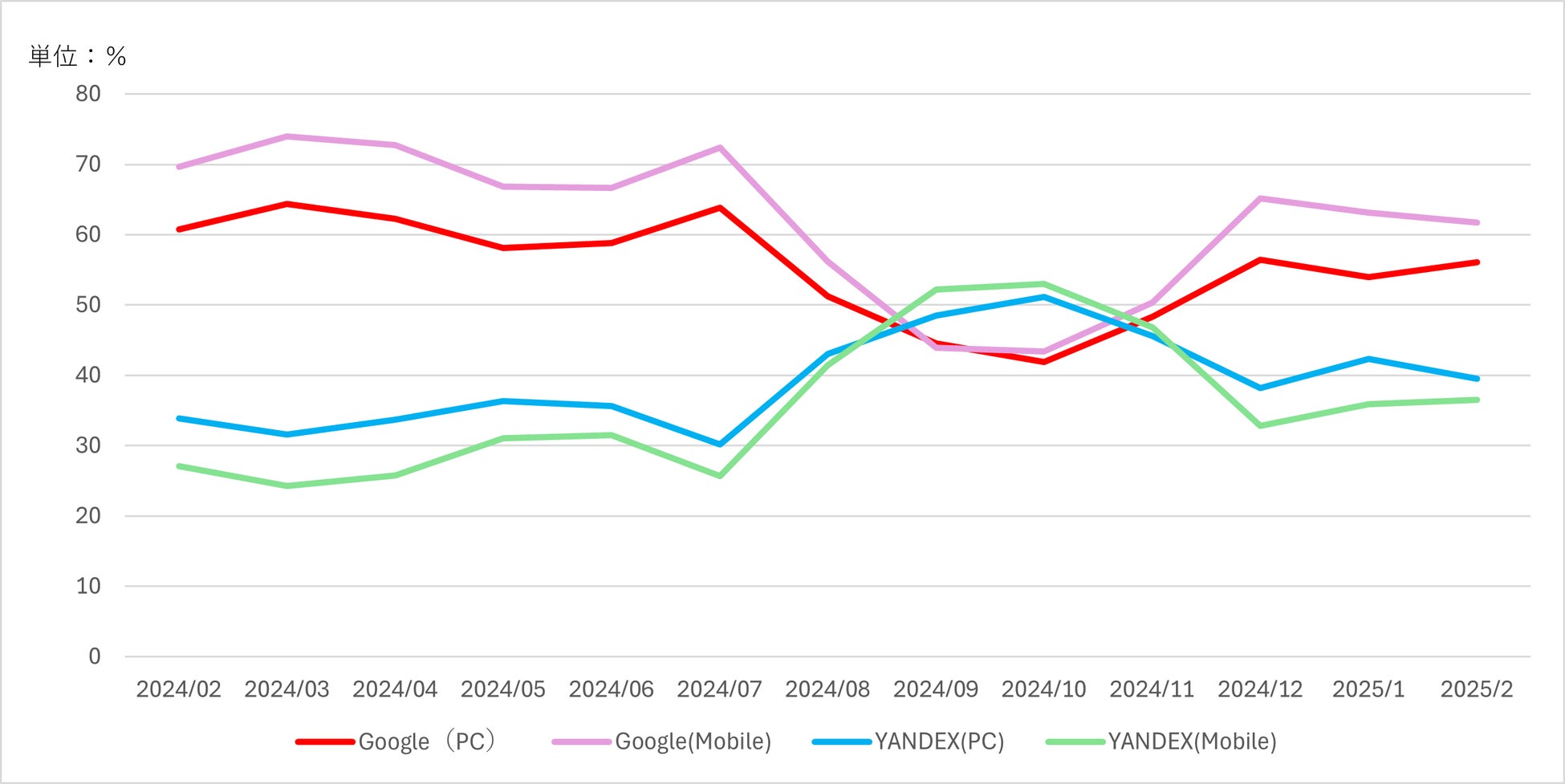 「ロシアのGoogle」とも言われている「Yandex」は、モバイルでのシェア率について、前回調査(2024年7月)時点と比較して、6.1%上昇しました。