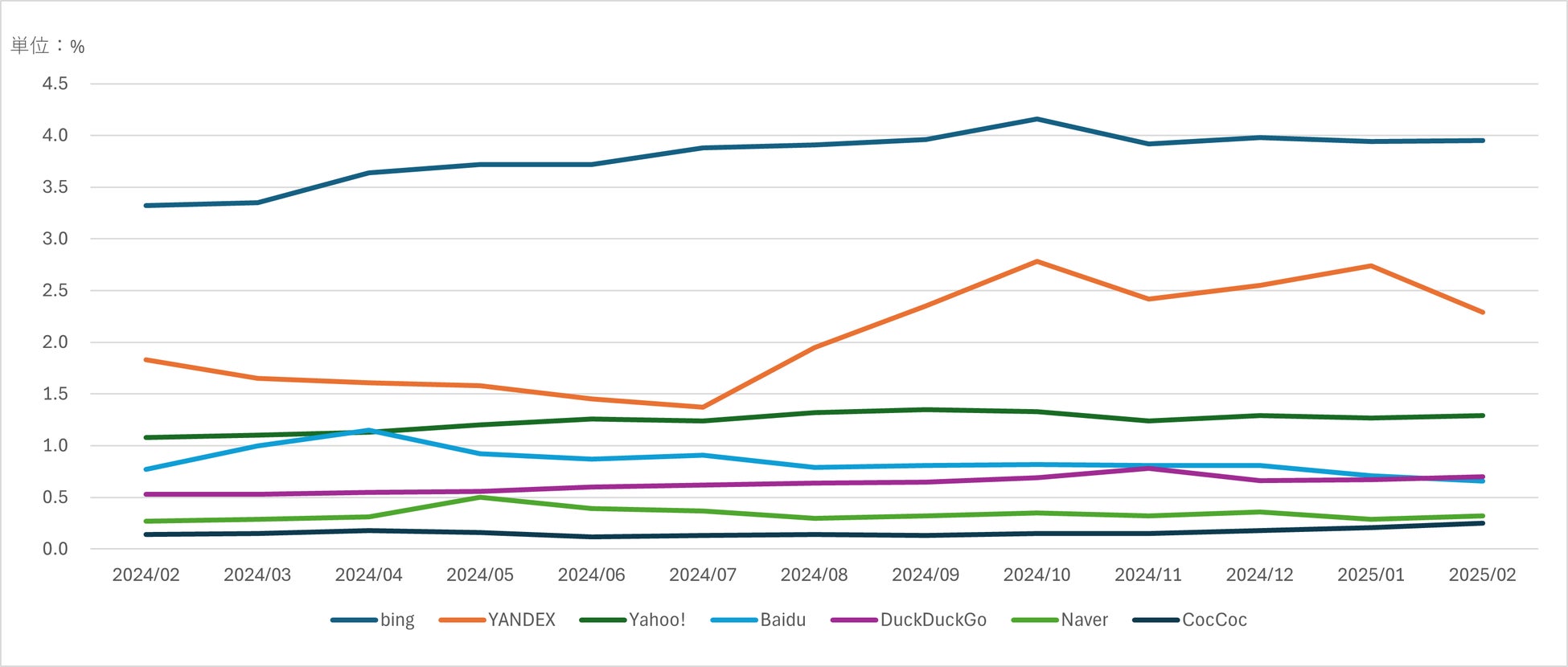 2024年2月からの約1年間における、Googleを除いた世界の検索エンジンシェア率の推移を参照すると、2024年2月と比較して2025年2月には、「Bing」が約0.6%の上昇と最も高く、次いで「Yandex」が約0.5%上昇しました。