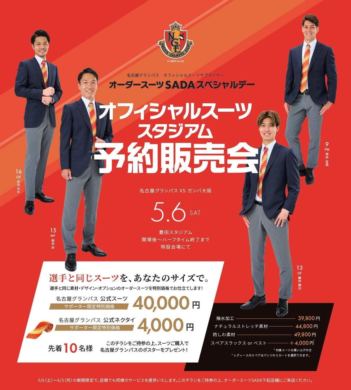 「名古屋グランパス」 オフィシャルスーツサプライヤー オーダースーツ SADA スペシャルデーオフィシャルスーツ予約販売会 5 月 6 日(土)開催