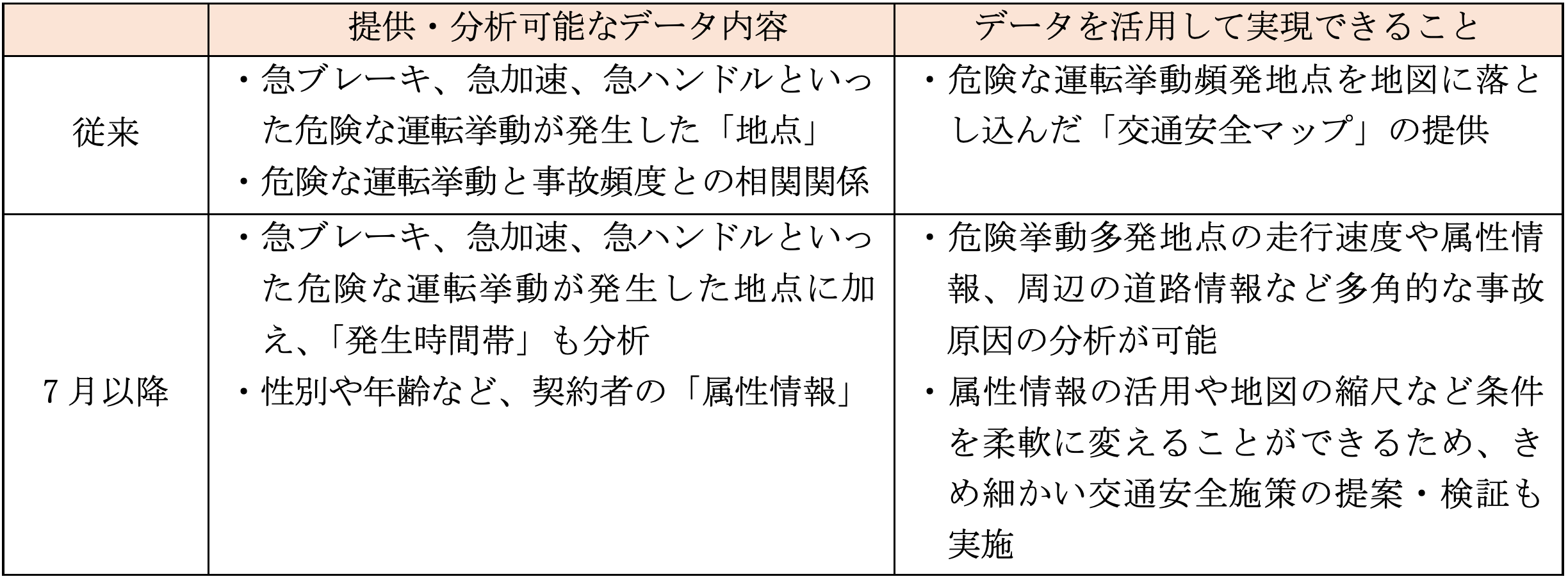 両社は、お客さま・地域・社会とともに共通価値を創造するため、テレマティクス自動車保険で蓄積したデータをはじめとするビッグデータにプライバシー保護技術を応用することで、安全性・有用性の高いデータ利活用環境の提供を行い、交通安全施策や都市計画、産業振興等の効率化や高度化に貢献します。