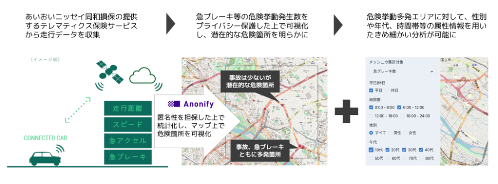 MS&ADインシュアランス グループのあいおいニッセイ同和損害保険株式会社(代表取締役社長:新納 啓介 以下、あいおいニッセイ同和損保)と株式会社LayerX(代表取締役CEO:福島 良典 以下、LayerX)は、あいおいニッセイ同和損保がテレマティクス※1自動車保険で蓄積する自動車走行データ※2などにLayerXの提供する最先端プライバシー保護技術「Anonify(アノニファイ)」を適用し、性別や年齢情報等を用いたデータ分析サービスの提供を7月から開始します。プライバシーを十分に保護しつつ、よりきめ細やかなデータの分析・提供が可能となることで、事故要因の特定や対策の実施、効果測定など地域の交通安全活動や安心・安全なまちづくりに貢献していきます。