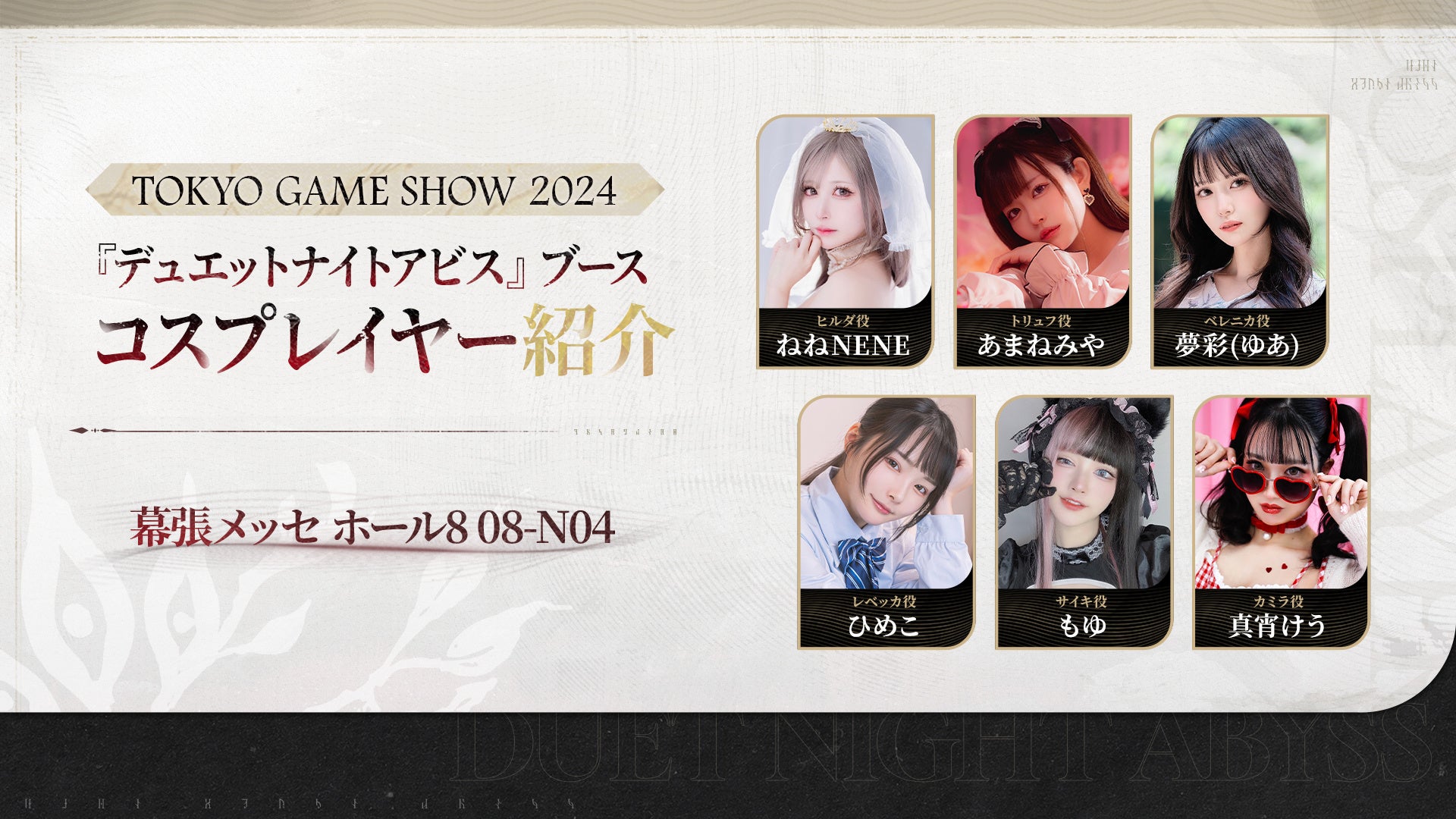 ほかにも人気コスプレイヤーの来場や、TGS2024限定グッズを含むノベルティグッズ配布など、ご来場のみなさまに楽しんでいただけるイベントを用意しておりますで、TGS2024へお越しの際はぜひ『デュエットナイトアビス』ブースへお立ち寄りください。