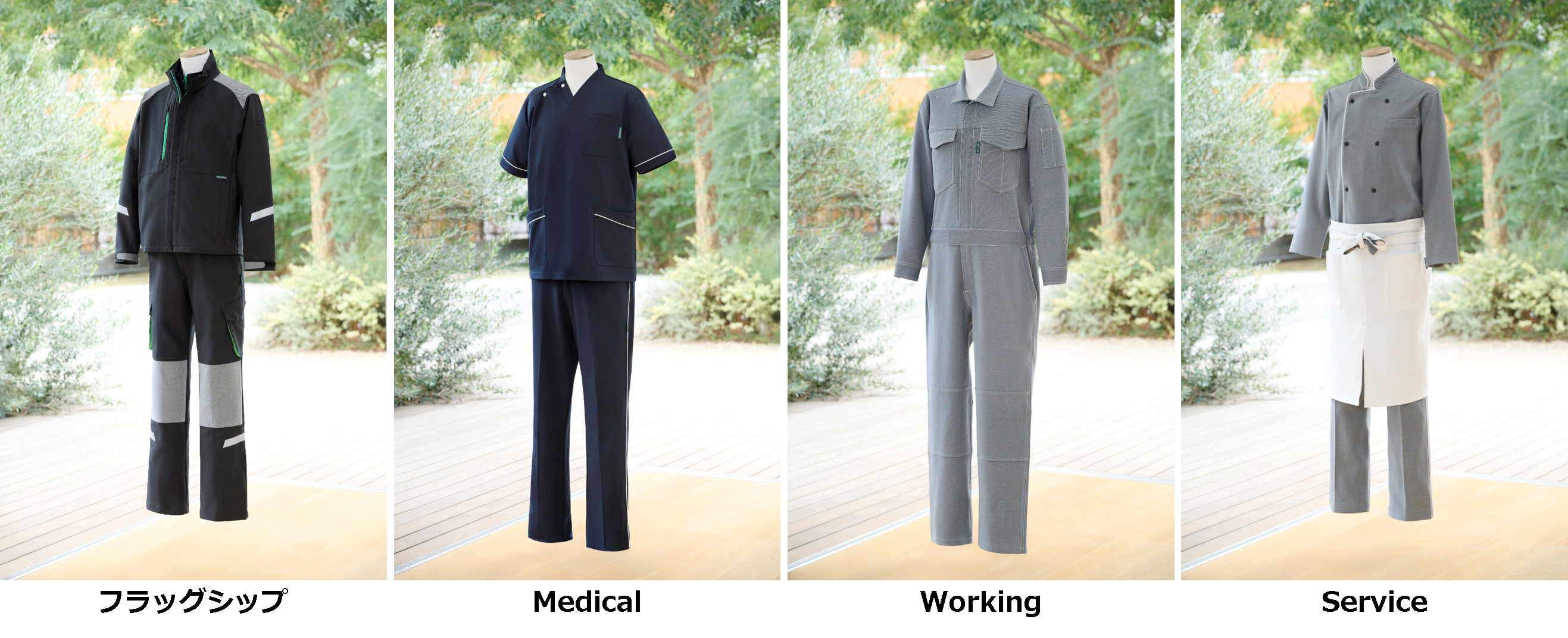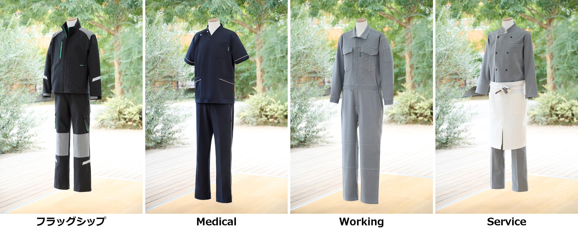 「GREEN UNIFORM」は、お客様の様々な環境、ご要望に合わせて、それぞれお客様向けのオリジナルデザインをご提案します。繰り返しの洗濯や消毒液の使用が頻繁に発生する医療業界向け(Medical)、日光にさらされる屋外での作業ユニフォームとして(Working)、また、油はねや漂白剤によって白抜けしてしまうことが多い飲食店などのサービス業界向け(Service)など、”完全持続型スキーム”をベースに、無水染色(原着)技術「e.dye®」の生地や、「BRING Material™」による再生素材を使用することで、着用すること自体が環境負荷の削減につながる製品をお届けします。