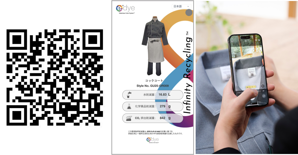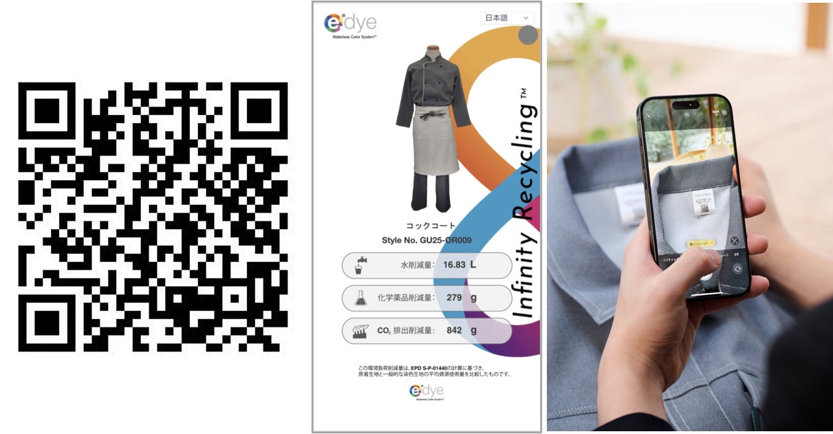 さらに、e.dye®が提供するサービスを活用し、EDP(Environmental Product Declaration:環境製品宣言)算出ができることで、環境負荷削減量の可視化も実現。「GREEN UNIFORM」の製品タグに付いたQRコードを読み取ると、e.dye®を通じた製品1着当たりに換算した水・化学薬品の使用量や、CO₂排出の削減量を確認することができ、ユニフォームを着用する従業員一人一人が、環境負荷削減への貢献度を実感できる仕組みとなっています。