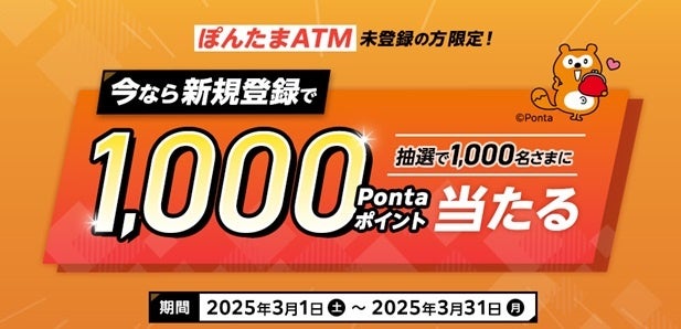 当行は、2025年3月1日(土)から3月31日(月)まで、「ぽんたまATM」に新規登録されたお客さまを対象に抽選で1,000名さまに1,000Pontaポイントが当たる「ぽんたまATM新規登録キャンペーン」(当キャンペーン)を実施いたします。