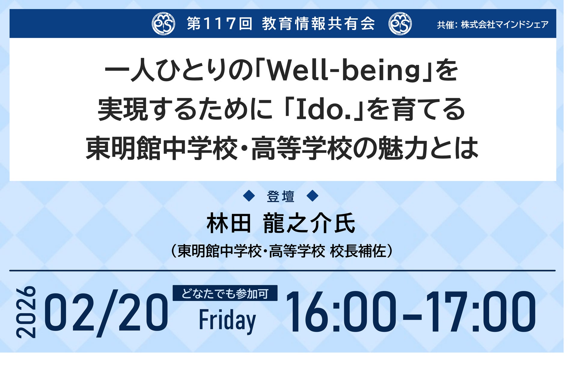 第117回教育情報共有会では「一人ひとりの「Well-being」を実現するために 「I do.」を育てる 東明館中学校・高等学校の魅力とは」というテーマで東明館中学校・高等学校 林田 龍之介校長補佐よりお話しいただきます。