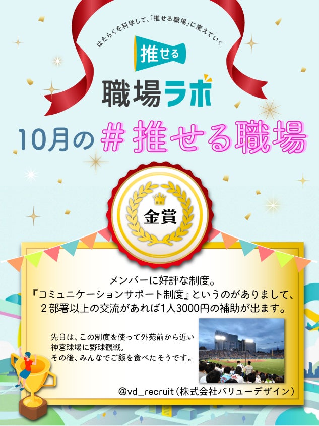 エンゲージメント向上を軸とした組織開発・人材育成コンサルティング支援を通して“推せる職場づくり”を進める株式会社NEWONE(本社:東京都千代田区 代表取締役:上林周平、https://new-one.co.jp/ 以下、NEWONE)は、「推せる職場ラボ」公式Xアカウントを通じて実施しているキャンペーンの10月度月間賞を決定しました。10月度の受賞者として、金賞には、株式会社バリューデザイン、銀賞にブロードマインド株式会社、銅賞に株式会社ピュアプラスを選出し表彰し、それぞれの取り組みを表彰しました。