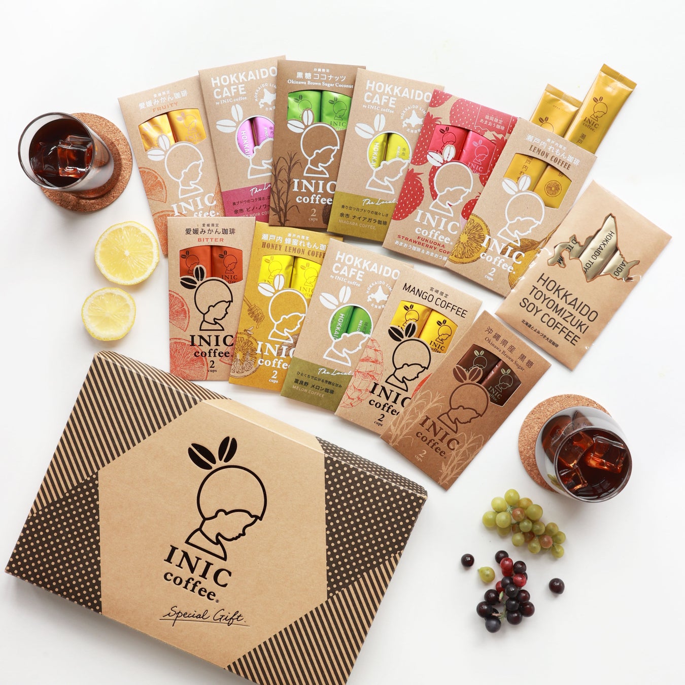 夏の暑さを吹き飛ばしていただきたい想いで個性豊かな12種類のフレーバーをまとめてお届けする今回のサマーギフトは、沖縄、宮崎、福岡、愛媛、瀬戸内、さらに北海道限定シリーズ「HOKKAIDO CAFE by INIC coffee」の限定商品がBOXに詰まっています。ありそうでなかった驚きの組み合わせで、まるで旅に出かけた気分をお楽しみいただけるはずです。いつもはその地域に行かないと手に入らない、特別な味わいをお楽しみください。