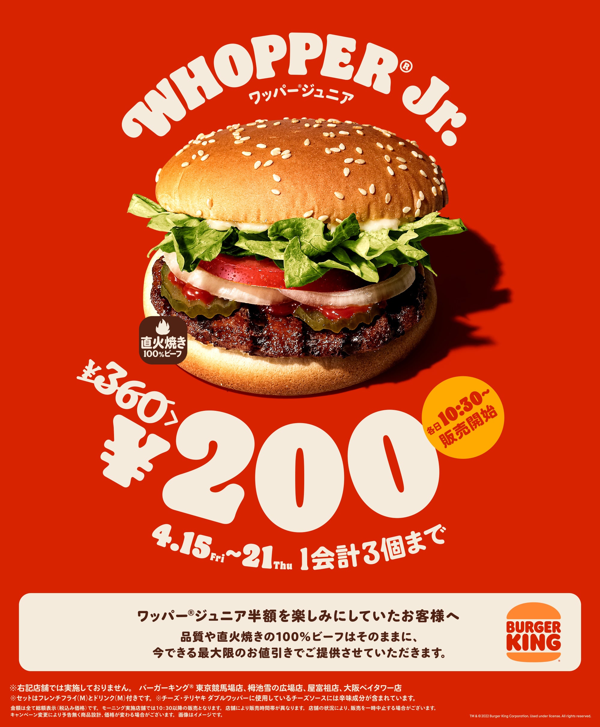 株式会社ビーケージャパンホールディングス(本社:東京都千代田区)は、2022年4月15日(金)~4月21日(木)の1週間限定で、各日10時30分から『ワッパー® ジュニア』を通常価格360円のところ、160円引きの200円で販売いたします。
