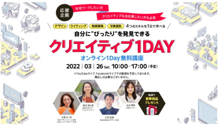 株式会社日本デザイン(本社:東京都池袋、代表:大坪拓摩(おおつぼ・たくま))は、2022年3月26日(土)10:00〜17:00にオンライン無料講座『クリエイティブ1DAY』をYoutubeライブ・Facebookライブにて開催します。WEBデザイナー、WEBライター等各分野のプロ4名が登壇し、未だ収束の兆しを見せないコロナ禍において、どうすれば市場価値の高い人材になれるのかについてプロの目線から解説する予定です。