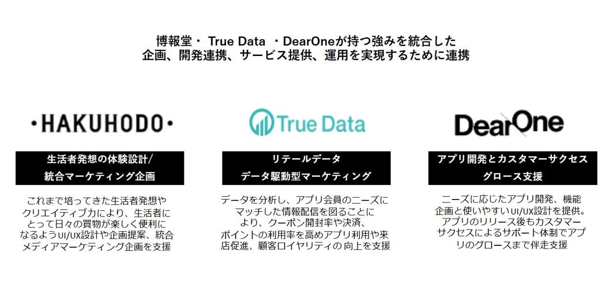 本ソリューションでは、博報堂・True Data・DearOneの3社それぞれが持つ強みを統合した企画、開発連携、サービス提供、運用を実現するために連携を図ります。