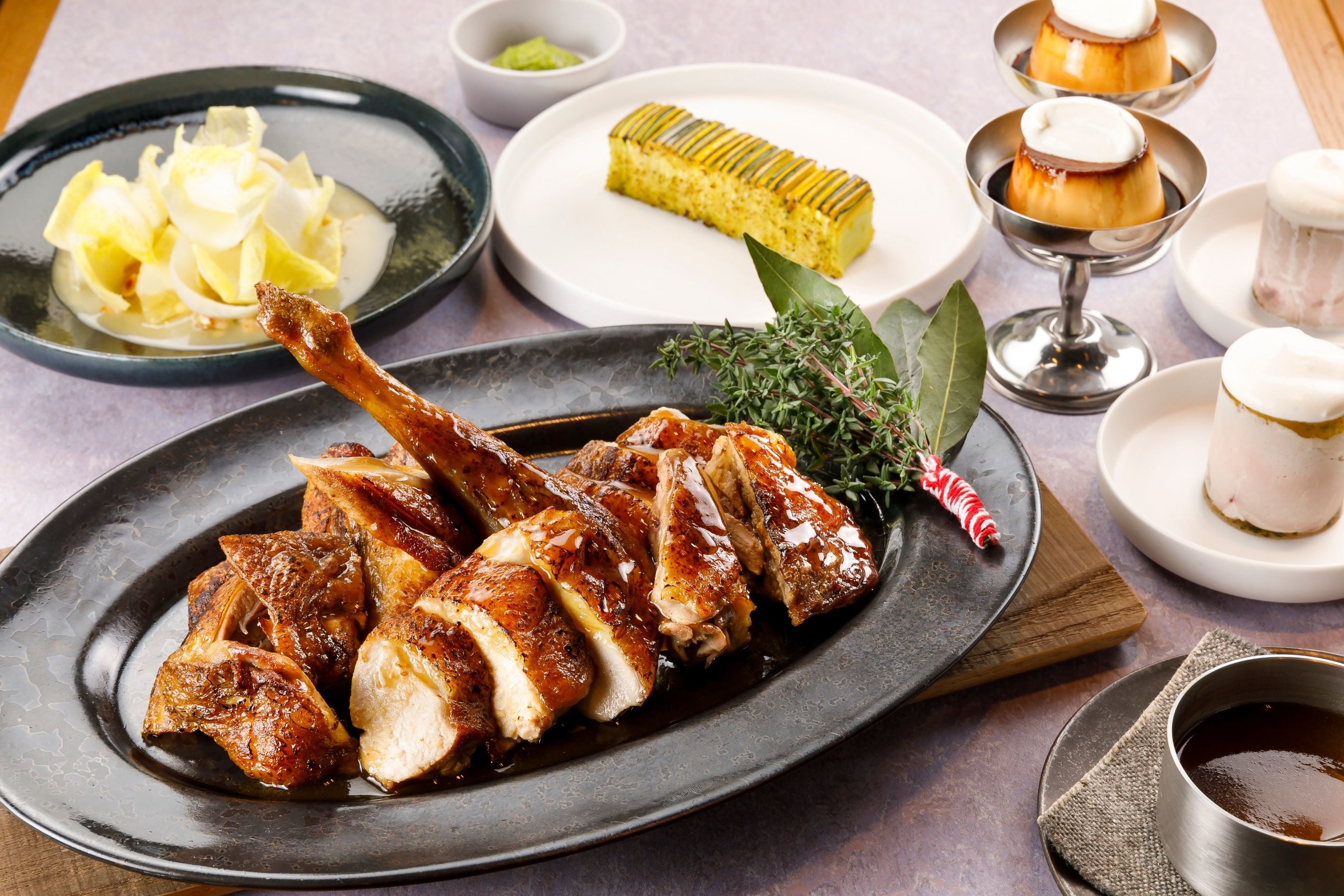 前菜には、濃厚なジュレに包まれたポーチドエッグをジャンボンブランで包み込み、生クリームとビネガーを合わせた酸味の効いたソースをかけた「アスピック −卵とジャンボンブランのゼリー寄せ−」をはじめ、黄色と緑の色鮮やかなズッキーニを丁寧に重ね合わせじっくりとグリルした温菜「ティアン・ド・クルジェット–ズッキーニの重ね焼き–」や、シャキシャキとした食感とヘーゼルナッツの心地よい食感とともに柑橘類のドレッシングでシンプルに仕上げた「アンディーブサラダ」の他、メインには、炭火でじっくりとジューシーに焼き上げた天草ホロホロ鶏に鶏の旨味が凝縮したソースで味わう至極の逸品が登場いたします。