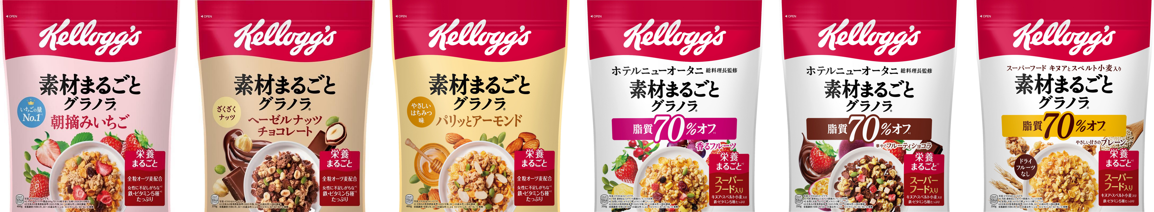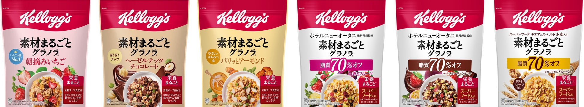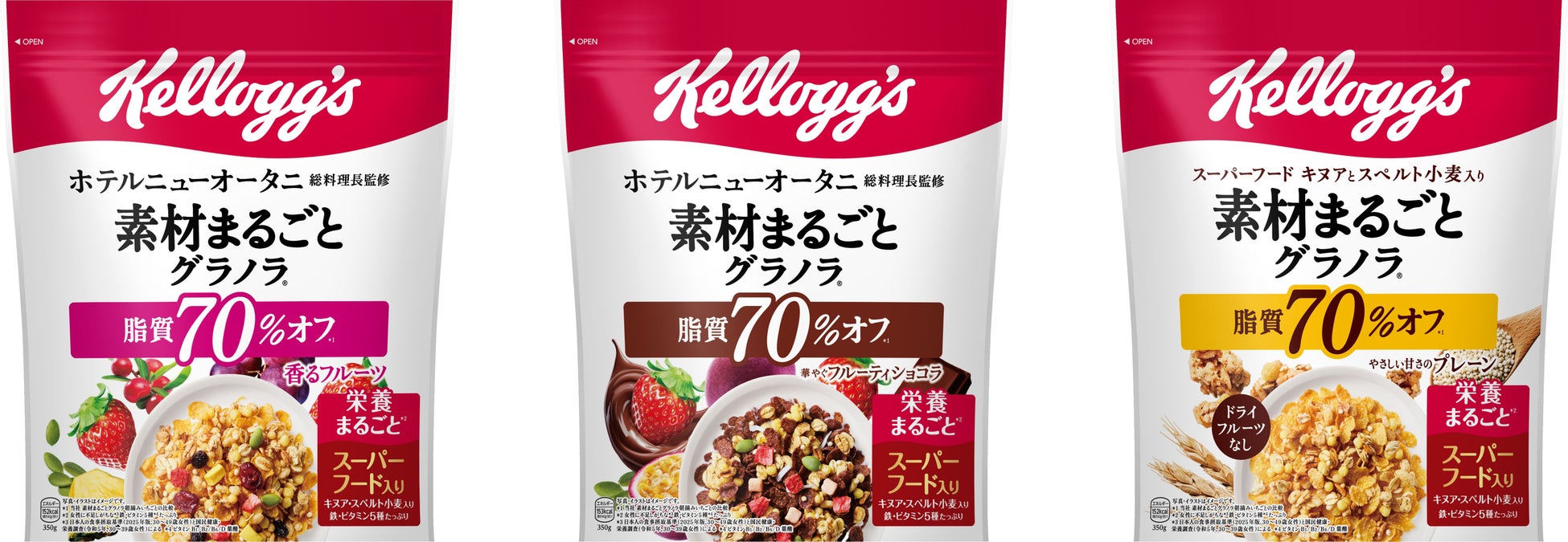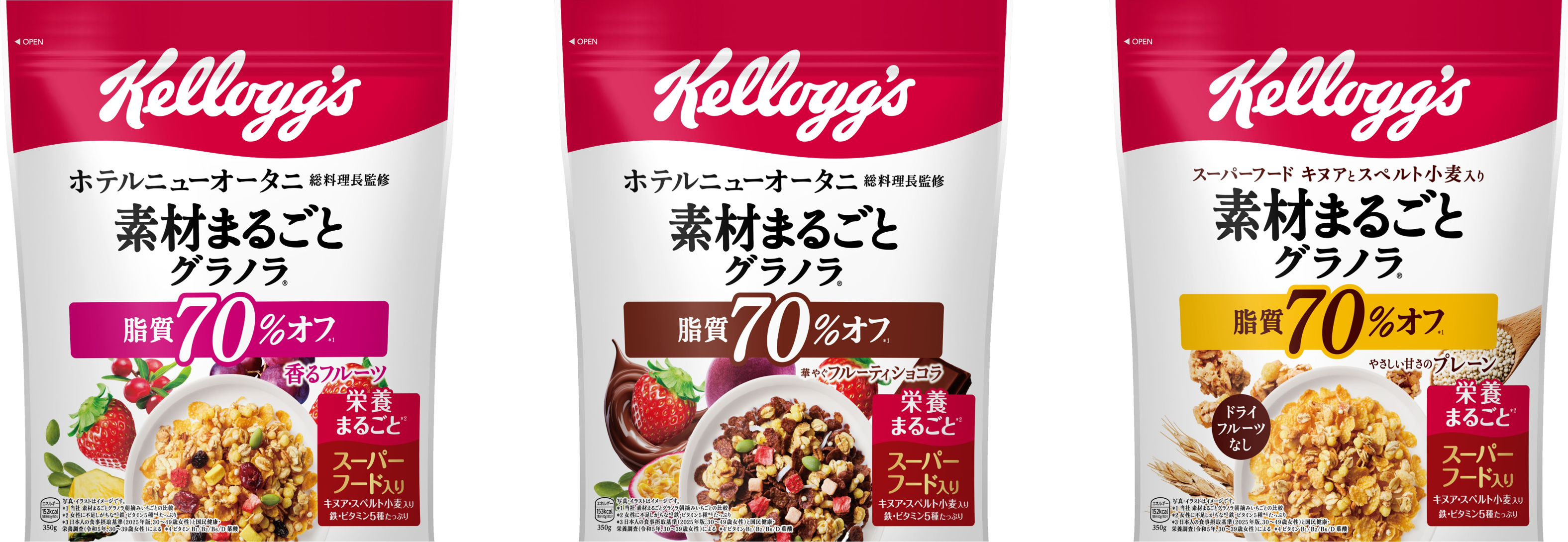 2022年の発売以降好評をいただいているケロッグの「素材まるごとグラノラ」シリーズは、手軽においしく栄養を摂りたいというニーズにお応えし、この春リニューアルします。「素材まるごとグラノラ 脂質70%オフ」の3品は、スーパーフードであるキヌアやスペルト小麦を配合しパワーアップしてリニューアル。「素材まるごとグラノラ 脂質70%オフ やさしい甘さのプレーン」も登場し、3月30日(月)より全国で発売します。